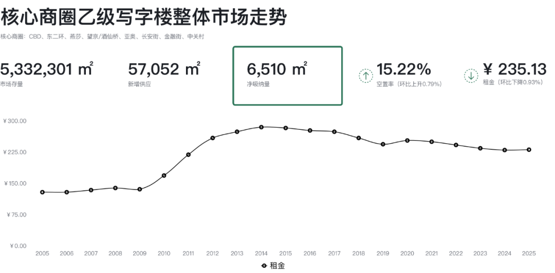 本季度核心商圈整體乙級(jí)寫字樓凈吸納量為6,510 平方米。乙級(jí)寫字樓的空置率環(huán)比上季度上升 0.79 個(gè)百分點(diǎn),錄得 15.22% ;成交租金仍呈下行趨勢(shì),環(huán)比上季度下降 0.93 個(gè)百分點(diǎn)至每平方米每月 235.13 元。其中 CBD 、金融街、亞奧商圈的成交租金降幅相對(duì)明顯,環(huán)比上季度降幅均超過 1.0 個(gè)百分點(diǎn)。