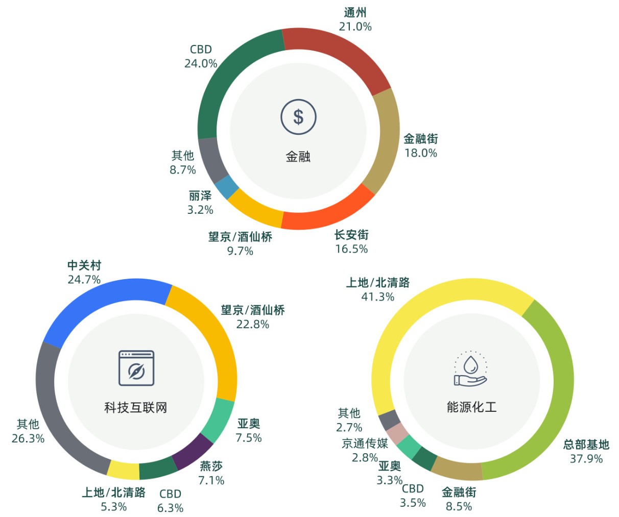 金融行業本季度主要成交面積為CBD、通州、金融街和長安街商圈,上述商圈本季度該行業成交面積占比超過全市的七成;受總部疏解政策影響,通州商圈成交面積占比有顯著增加。