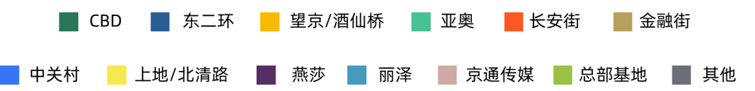 本季度科技互聯網行業在中關村及望京/酒仙橋商圈成交面積占比顯著,接近全市的五成;此外,亞奧、燕莎等商圈也有眾多該類企業落位。